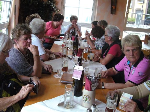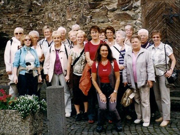 Am 25.07.2009 machte die Turngruppe von Esther Reichmann einen Ausflug an die Lahn. Die meisten der Turnschwestern konnten bei der Tagesfahrt dabei sein. Vier konnten leider wegen Krankheit nicht mitfahren. Der Zug ging morgens von Haiger los. Helli hatte Frühstück und Sekt mitgebracht um auf ihren Geburtstag einen auszugeben. Gut gelaunt kam die Gruppe in Nassau an. Dort erwartete sie ein Führer um ihnen die Stadt zu zeigen und die Nassauer etwas näher zu bringen. Nach einer Stunde gab es ein Mittagessen im Ratskeller. Mit viel Musik wurde die Gruppe um 13 h auf dem Floß erwartet. Bei Sonnenschein genossen sie die schöne Landschaft. Nach einem Korn, einem Bier und einem Schmalzbrot kam richtig Stimmung auf. Gegen 16.00 Uhr legten sie wieder in Nassau an. Anschließend gingen sie in das Restaurant „Zur Stadthalle“ wo sie bei guter Laune bis 19.30 Uhr gesessen und gelacht haben. Müde und abgeschlagen kamen die Frauen dann um 23.00 wieder in Haiger an. |