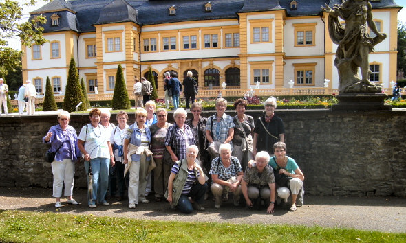 Tagestrip in die Mainfränkische Metropole Würzburg Voller Vorfreude bestiegen am 8. Juli 2011 16 Turnerinnen der 50+ Gruppe des TV Holzhausen frühmorgens den Reisebus. Gemeinsam wollte man einen schönen Tag am Main verleben. Eine Turnschwester hatte Geburtstag und es gab Frühstück mit Sekt. Anschließend überraschte uns Maria mit einer schönen Tombola. So war die Hinfahrt nicht langweilig. Nach 3 Stunden erreichten wir das schöne Städtchen Veitshöchheim. Nachdem das Schloss umrundet und die Blumenpracht bewundert wurde ging es weiter durch den herrlichen Rokoko-Garten, einem der schönsten in Europa. Per Schiff steuerte die Gruppe Würzburg an. Während der Schifffahrt hatte man sich gestärkt und war nun für eine Führung durch die sehenswerte Altstadt gerüstet. Nach der Besichtigung des Domes St. Kilian war es nicht weit bis zur Alten Mainbrücke, von wo aus der schönste Blick auf die Festung Marienberg, hoch über Würzburg, zu genießen war. Bei herrlichem Wetter ließ die Gruppe den Nachmittag in einem der zahlreichen Straßencafes ausklingen. |