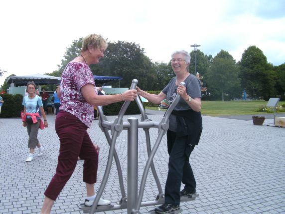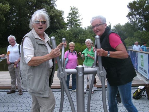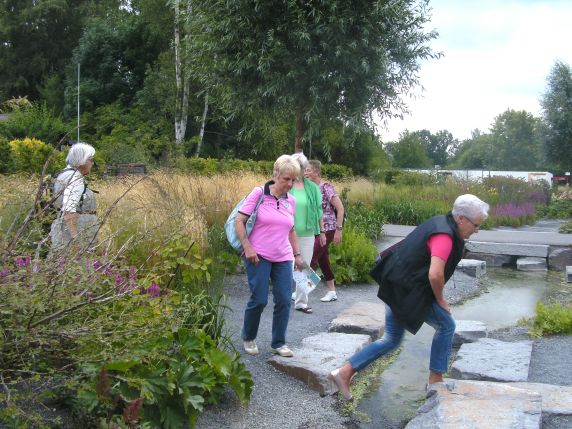 Am 5. Juli fuhren wir mit 16 Frauen der 60+-Gruppe zur Landesgartenschau nach Gießen. Mit dem Zug gings ab Haiger Richtung Gießen und dann mit dem Bus direkt zur Landesgartenschau. In kleineren Gruppen erkundeten wir das Gelände. Man bestaunte die große Blumenvielfalt und erkannte manche Sorte wieder die man im eigenen Garten hatte. Aber auch viele Neuheiten und Ideen für den Garten gab es zu entdecken. Mittags trafen wir uns dann alle zu einem kleinen Snack im Bistro am Schwanenteich. Mit einer Bimmelbahn fuhren wir gemeinsam zu den Lahnauen. Dort befindet sich das „Lahnfenster“, eine Fischaufstiegshilfe mit Besucherraum zur Beobachtung der Unterwasserwelt. Den Abend ließen wir im Gießener Brauhaus ausklingen bei leckerem Essen und hausgebrautem Bier. |
