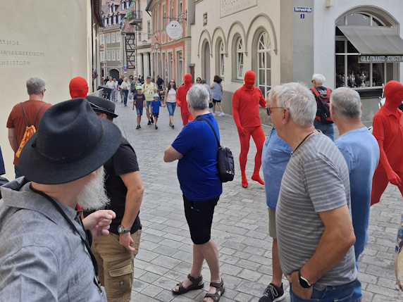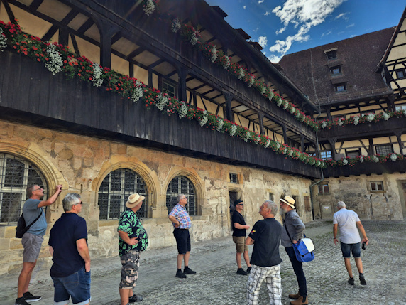 Samstags nach einem ausgiebigen Frühstück im Hotel hatten wir eine Zunftführung " Färber, Gerber, Müllersleut" entlang der Regnitz gebucht, sehr interessante Einblicke zu dem damaligen Stadtleben und Handwerksarten in Bamberg. Mittags ruhten wir bei einem kleinen Snack auf einer Dachterasse mit Blick auf die Regnitz. |